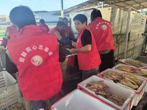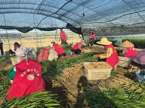 夕阳映照姜田美,晚风送来收获香。20余名志愿者踏着夕阳来到田间,手持农具,与姜农们一起弯腰劳作。了解到采收时间的紧迫,协商分为了两个小分队。一队深扎姜田,挖姜、去泥、剪杆、装筐,每个环节都配合默契。另一队前往洗姜区,大家分工协作,清洗、分拣、打包……暮色渐浓时,黄灿灿的冠英“仙女姜”排列整齐等待发车运往各地消费市场。经过“志愿红”3个多小时的共同努力,有效缓解了姜农的采收压力。