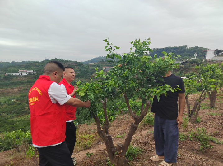 同心村志愿者在帮村民查看柑橘嫁接生长情况