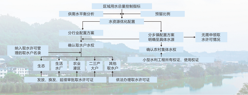 五通桥区域水权改革总任务是根据用水总量控制指标,在供需水平衡分析的基础上,经适当预留应急水源后通过分行业、分乡镇水资源优化配置,明确规划年各乡镇、各行业初始水权,并明确至具体水源。除不需要申请领取取水许可证取水户外,将乡镇、行业水权进一步分配至取水户、灌区及农村集体。